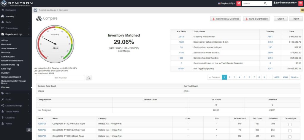 The best method of comparing any POS/ERP inventory with Senitron is to download the quantities from the POS/ERP, and to upload it into the Senitron Inventory Compare page.  The compare page has been designed to quickly highlight for you the discrepancies. On this page you can quickly choose to sync the "discrepancies" back in the POS/ERP system, via API's and/or CSV downloads./uploads.
